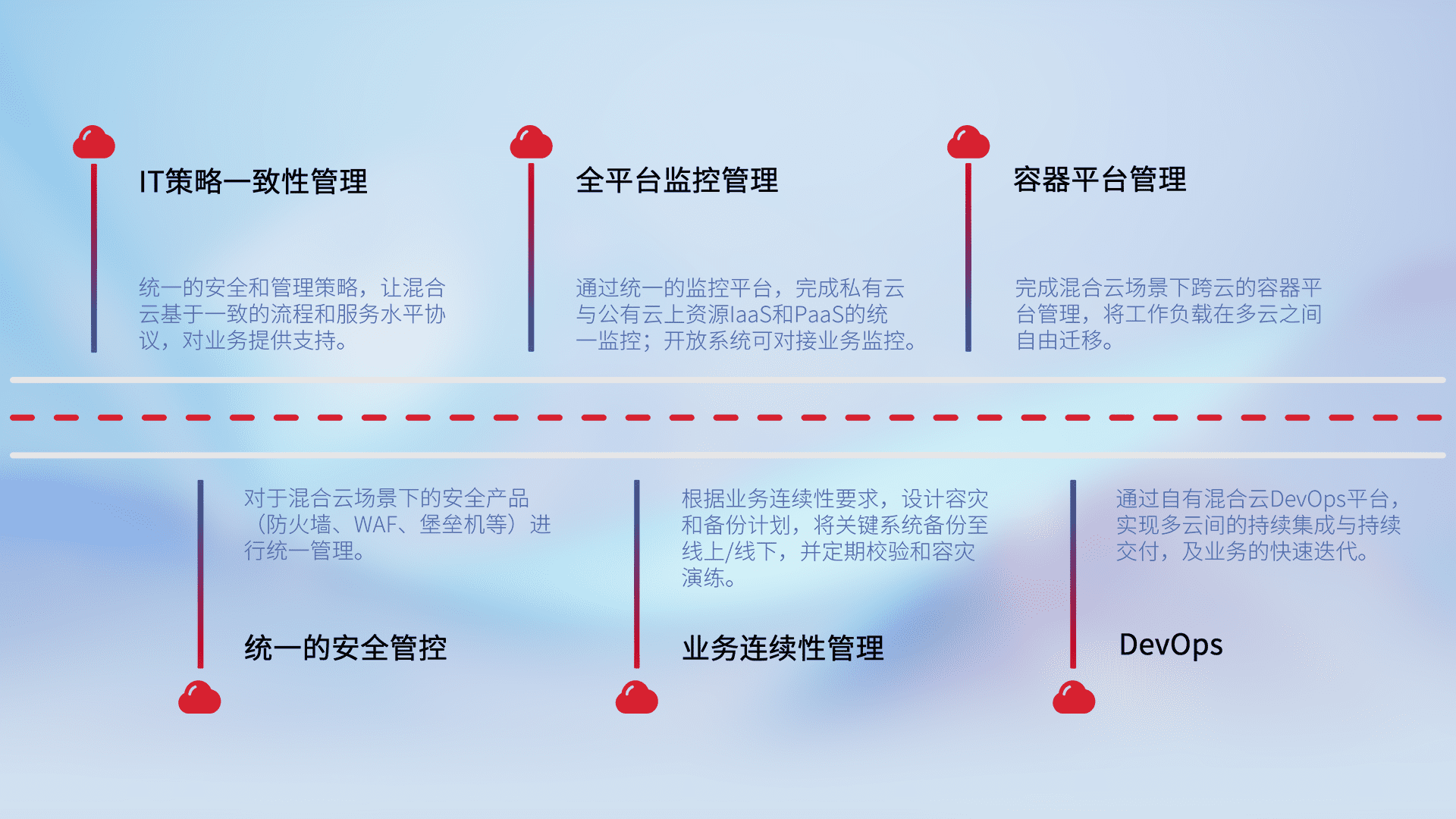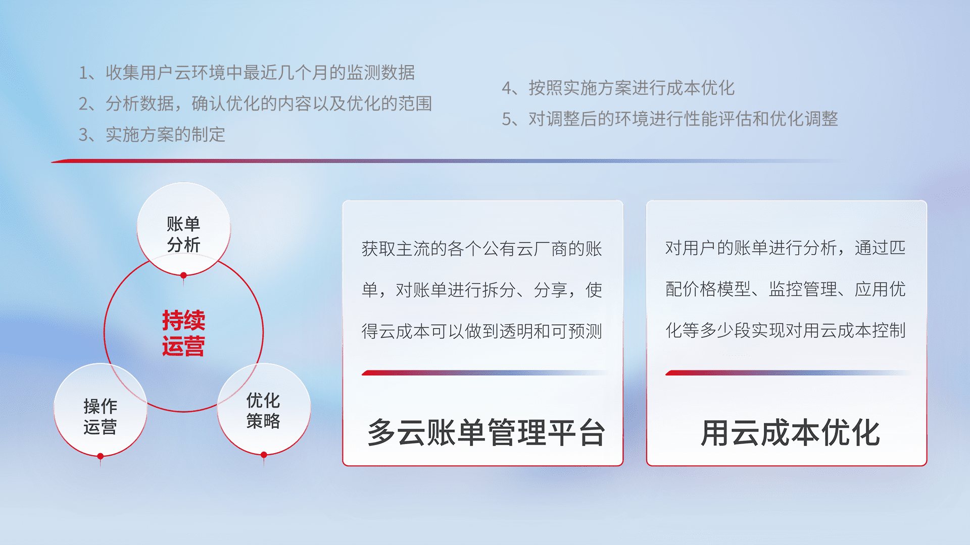 通过多云纳管,,以统一的资源数据模型把客户的云资源进行抽象和封装,,,进而实现对多云资源的统一操作,,,,保障云资源管理的可靠性、、、稳定性与可用性。。。量身定制化运维内容,,配置、、、开发运维、、、补丁管理、、备份、、监控、、、认证和访问管理、、、审计和日常巡检等,,,,保障在用云过程中的可靠度,,,稳定度以及高可用率。。。。