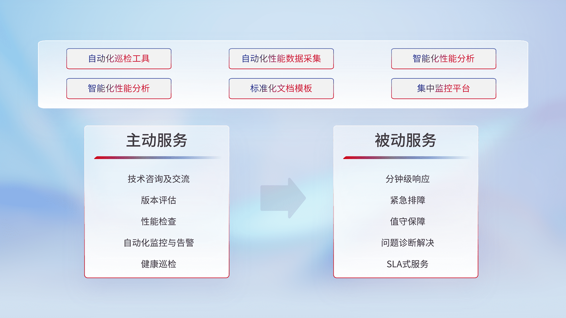 智能化工具和标准化文档,,保障服务质量,,提供主动服务(包含技术咨询、、版本评估、、性能检查、、自动化监控与告警、、、健康巡检)和被动服务包含(分钟级响应、、、、紧急排障、、、、值守保障、、、、问题诊断解决、、、、SLA服务)。。。。