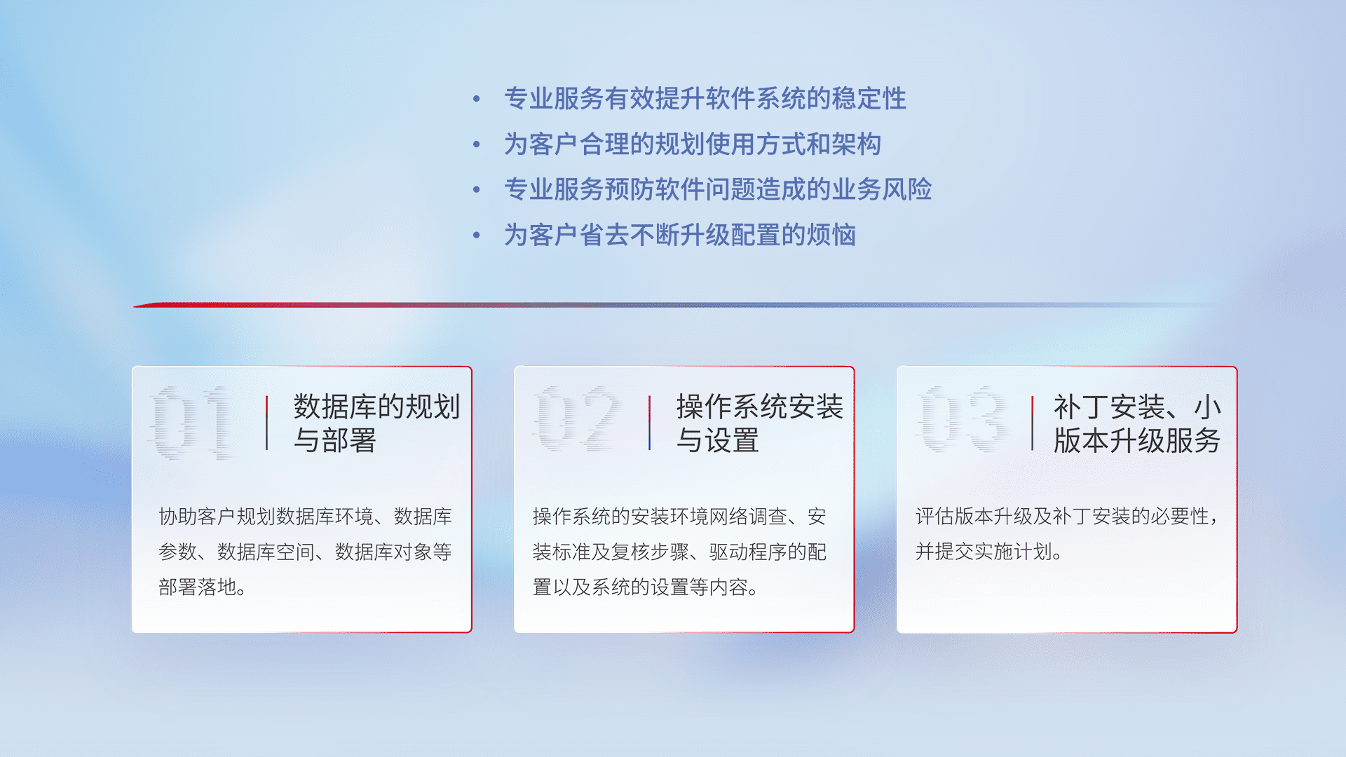 为客户提供软件规模升级、、快速部署、、、、按需配置的专业服务,,,,从数据库的规划与部署到操作系统的安装与设置,,再到补丁安装和小版本升级提供支持。。。